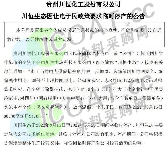 磷矿龙头川恒股份:位于四川省什邡市的全资子公司川恒生态科技有限公司接到有关部门让电于民政策要求,于8月15日至8月20日期间将临时停产。