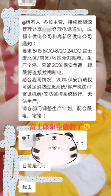 成都富士康从15日至20日限电,仅保留20%保安负载,全厂生产停止。生产线员工表示,已接到休息通知。富士康方面回应称,目前对其运营影响不大。