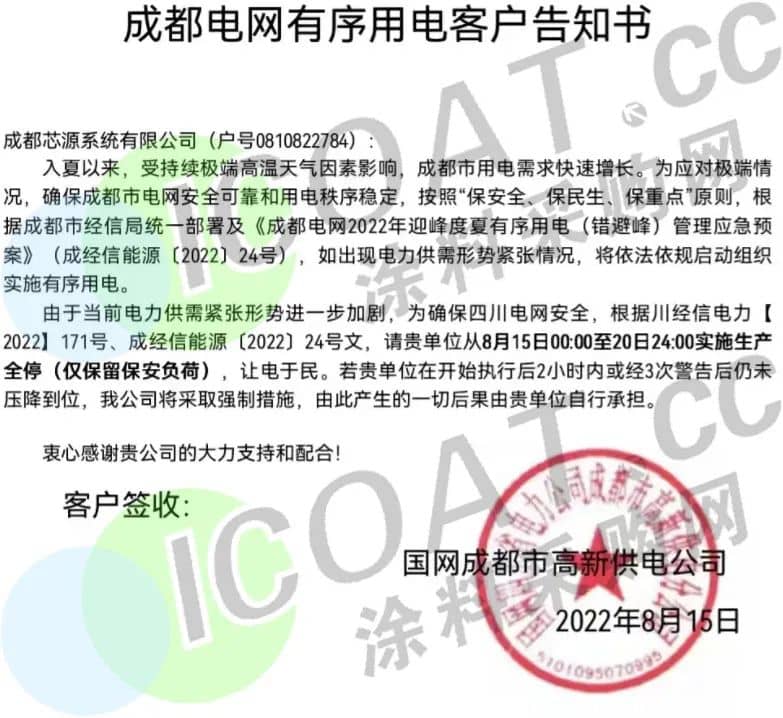 国网成都市高新供电发布《成都电网有序用电客户告知书》称,从8月15日起0时至20日24时实施生产全停(仅保留保安负荷)让电于民。若在开始执行后2小时内或经3次警告后仍未压降到位,将采取强制措施。