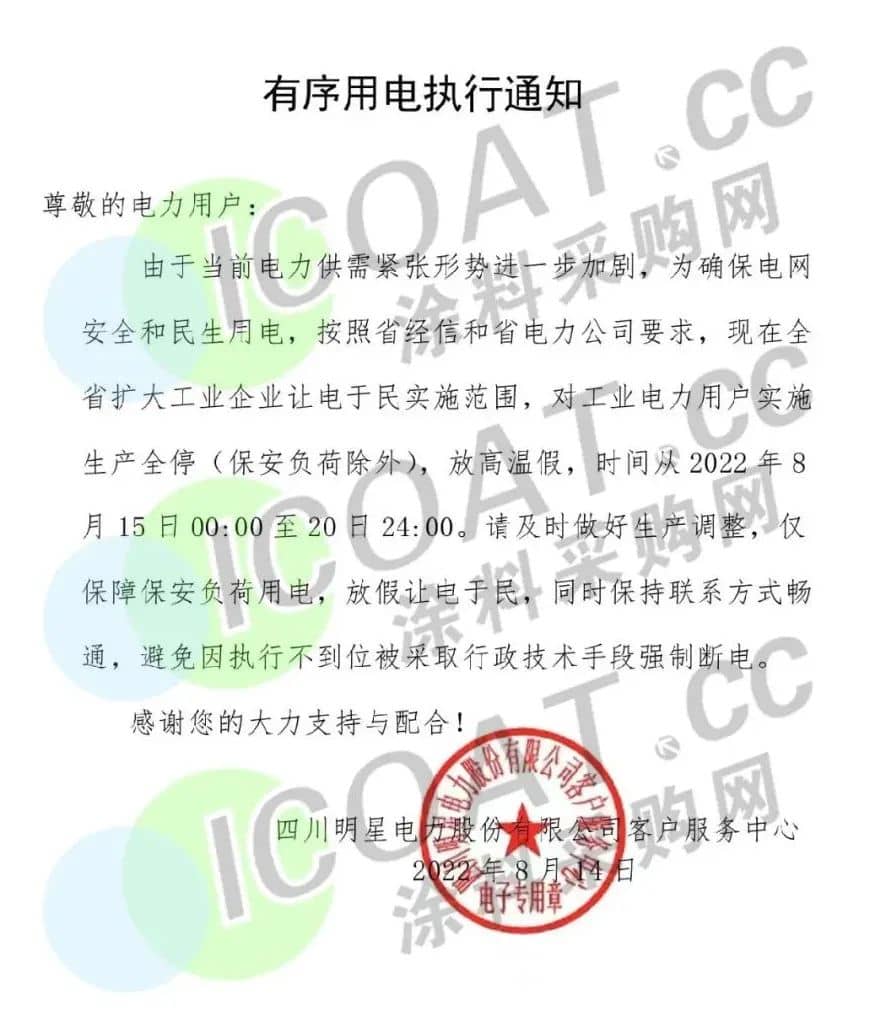 四川明星电力发布《有序用电执行通知》,按照省经信和省电力公司要求,现在全省扩大工业企业让电于民实施范围,对工业电力用户实施生产全停(保安负荷除外),放高温假,时间从2022年8月15日00:00至20日24:00。