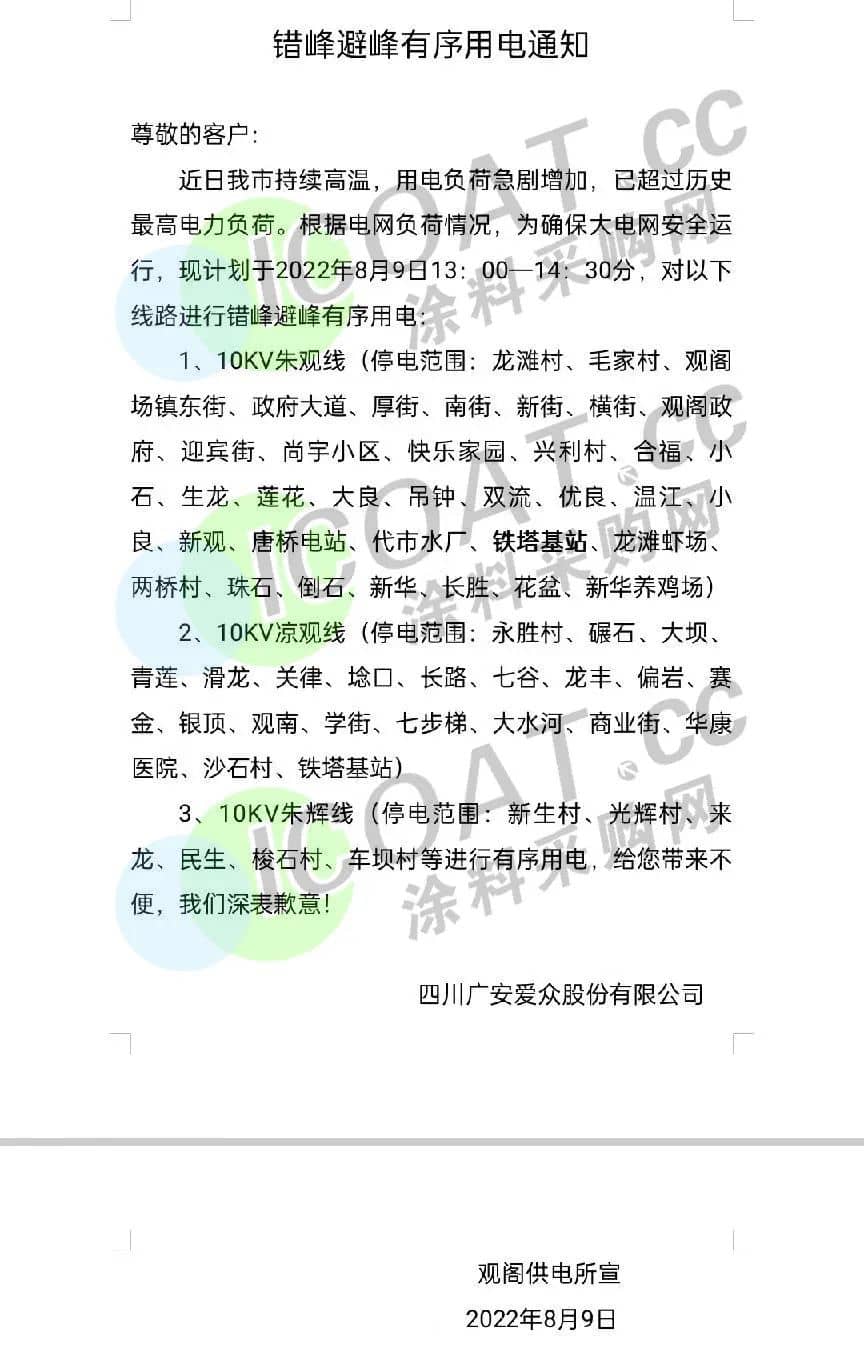 四川广安爱众股份观阁供电所发布《错峰避峰有序用电通知》,现计划于2022年8月8日13∶00-14∶30分,对部分线路进行错峰避峰有序用电,另一部分进行有序用电。