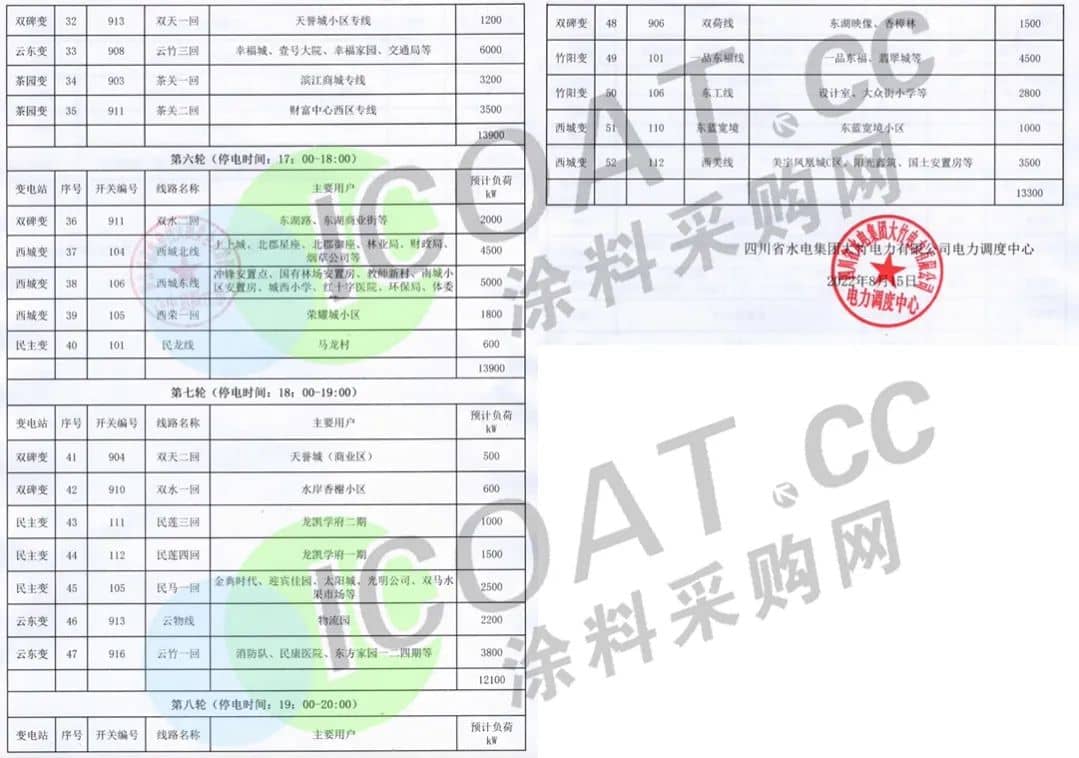 四川省水电集团大竹电力发布迎峰度夏城区居民用电线路紧急限电序位表,要求16日各变电站按时间段进行八轮限电,时间从11点到20点,每个轮次停电1小时。