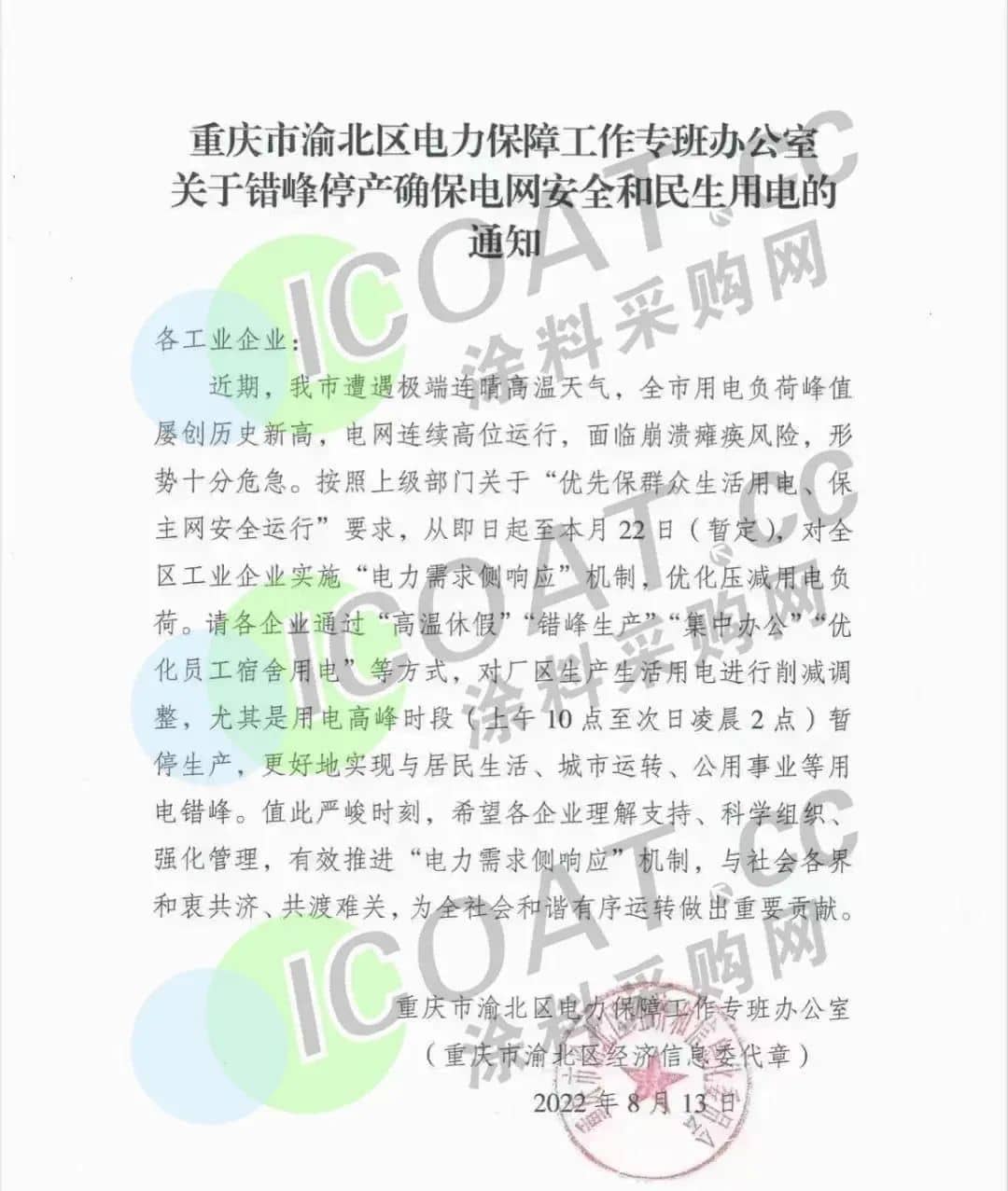 重庆市渝北区发布《关于错峰停产确保电网安全和民生用电的通知》,从即日起至本月22日(暂定),对全区工业企业实施“电力需求侧响应”机制。请各企业通过“高温休假”、“错峰生产”、“集中办公”、“优化员工宿舍用电”等方式,对厂区生产生活用电进行削减调整,尤其是用电高峰时段(上午10点至次日凌晨2点)暂停生产,更好地实现与居民生活、城市运转、公用事业等用电错峰。