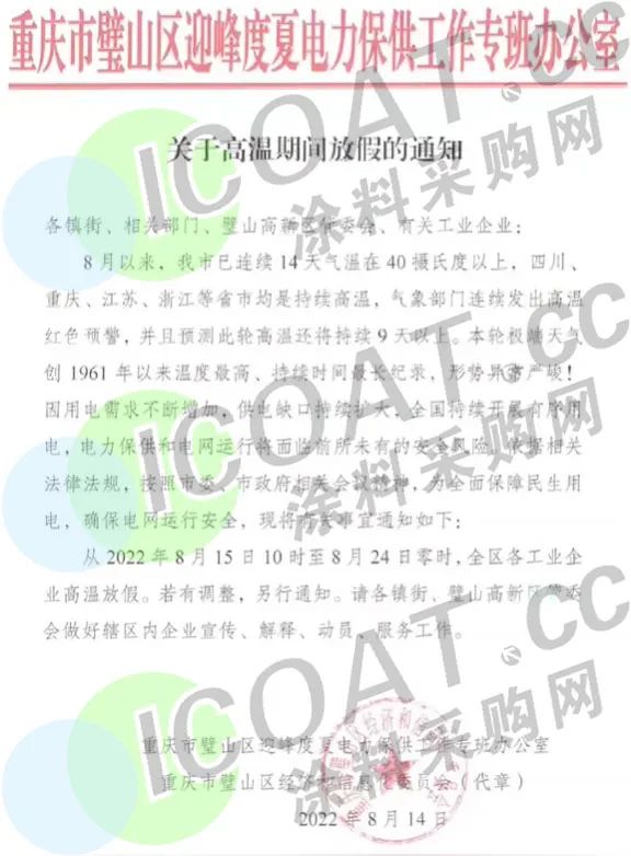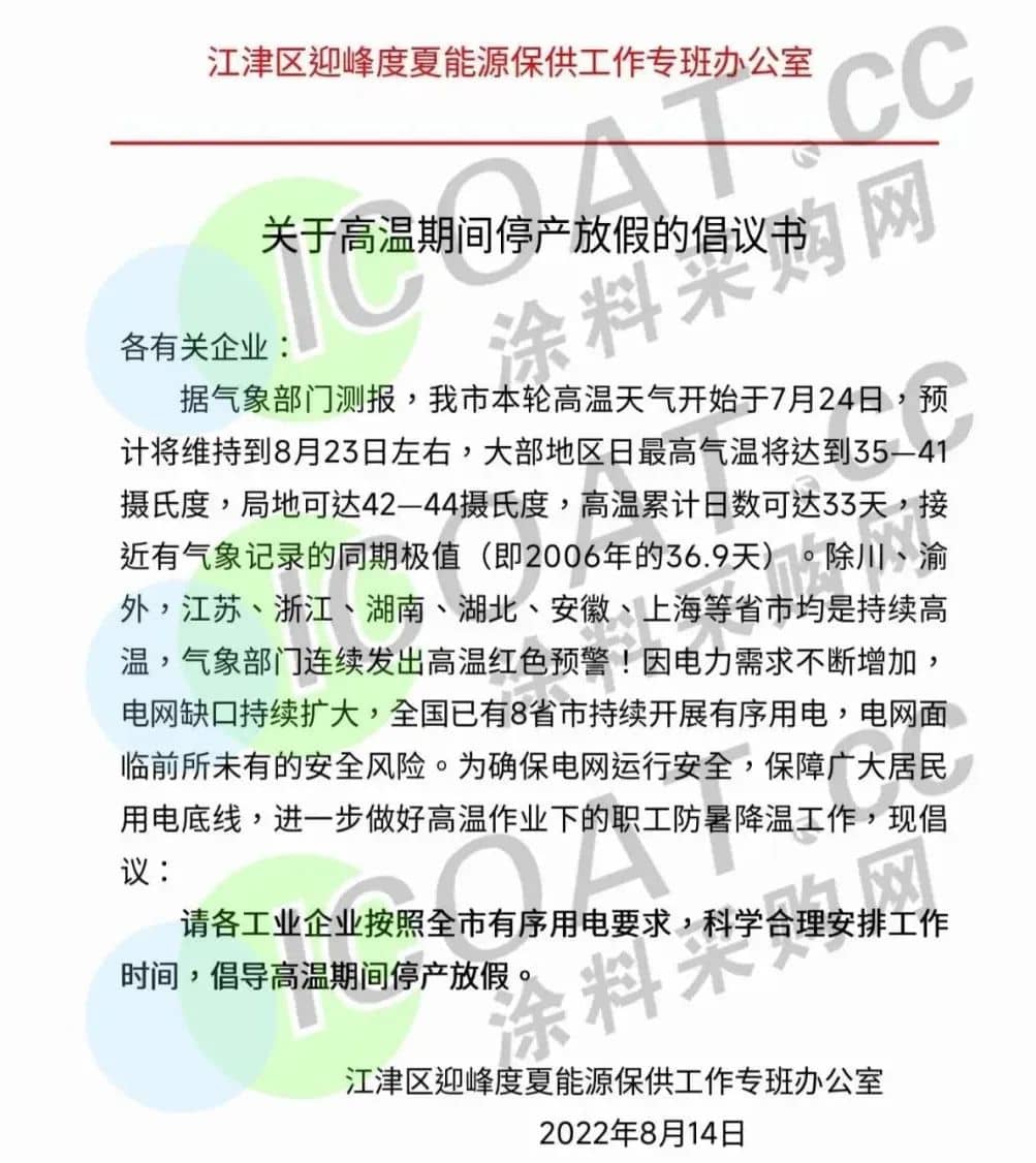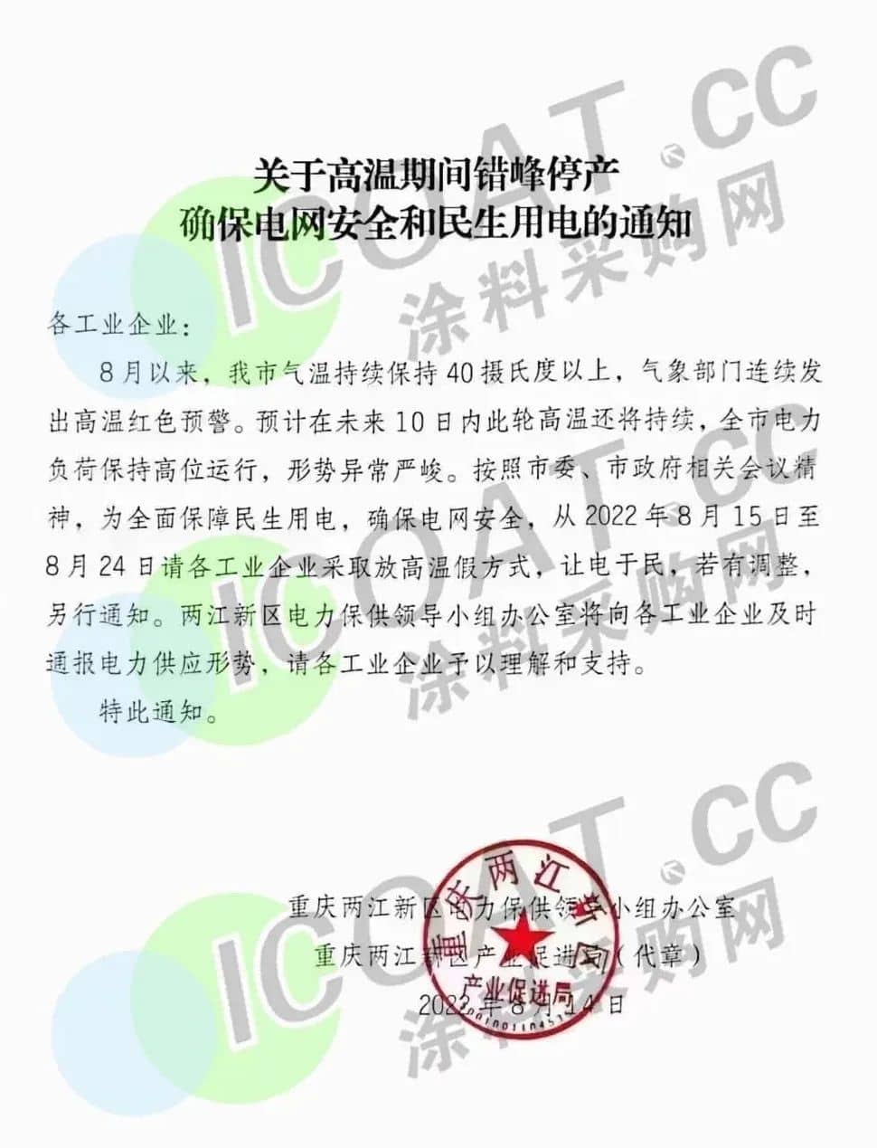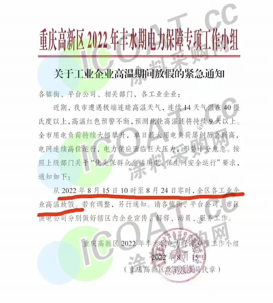 重庆两江新区《关于高温期间错峰停产确保电网安全和民生用电的通知》称,从2022年8月15日至8月24日请各工业企业采取放高温假方式,让电于民。