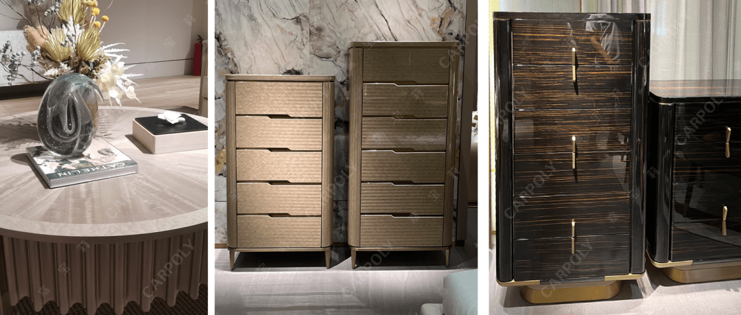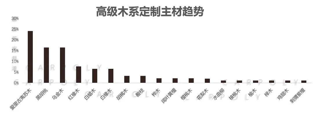 高级木系定制家具主材为高端实木,其中使用频率最高的三种基材分别是:爱里古夷苏木、乌金木、黑胡桃。爱里古夷苏木、乌金木,核桃木这些产自非洲的材质在展会使用较多,主要源于它们纹理美观与实用性兼具,因此使用越来越广泛。