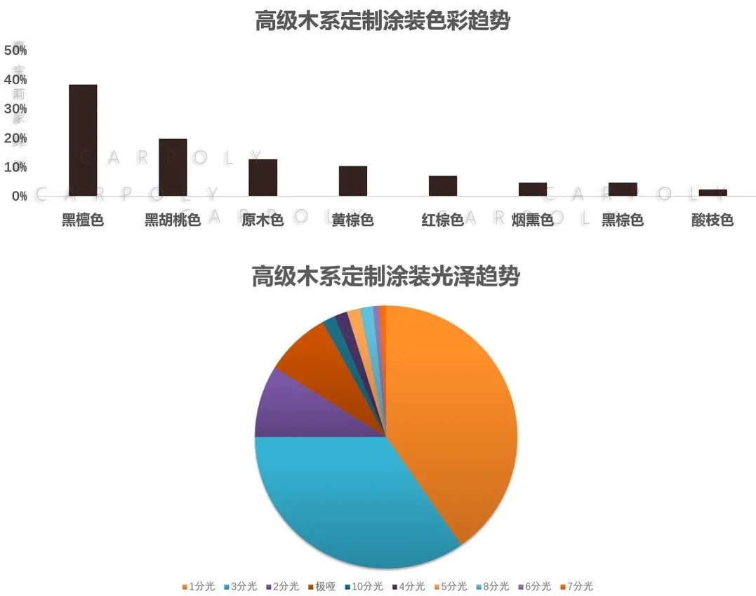 与往年相比,黑檀色首次超越黑胡桃色,成为高定木系定制使用最多的色彩效果。其中爱里古夷苏木、乌金木、核桃木都以黑檀色为主,光泽度在1-3分光,呈现薄、透、闪的高透效果。