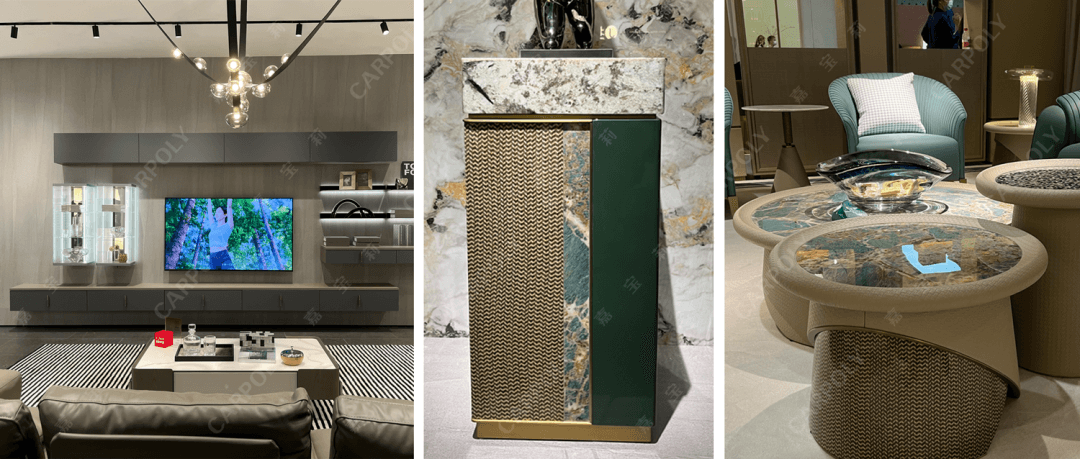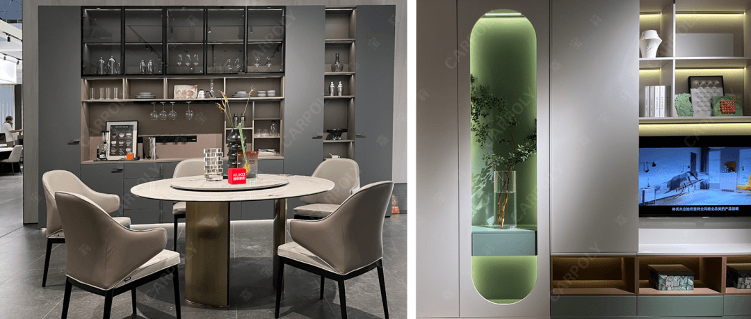 展会上,高级整装定制家具主材以板木结合居多,饰面效果以免漆板、科技木皮、透明/半透/实色涂装为主。