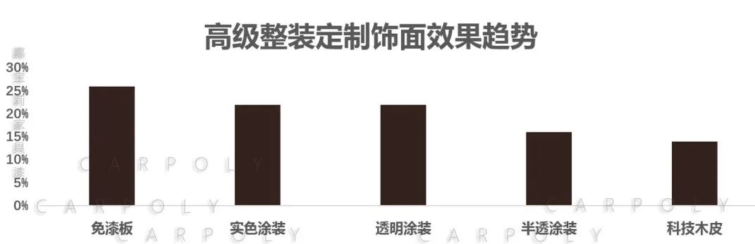 科技木皮纹理多样,色彩丰富,以透明涂装为主,光泽两级分化,一分光和高光效果平分秋色。