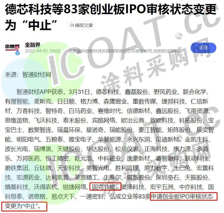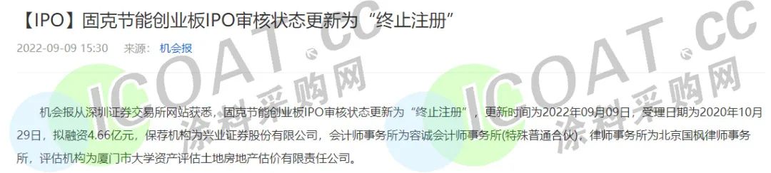 近日,知名涂料企业固克节能主动要求撤回注册申请文件,根据《创业板首次公开发行股票注册管理办法(试行)》第三十条的规定,证监会决定终止对公司发行注册程序,这也是固克节能二度闯关IPO并以失败告终。