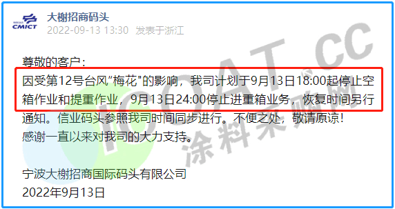 大榭招商码头计划于9月13日18:00起停止空箱作业和提重作业,9月13日24:00停止进重箱业务,恢复时间另行通知。信业码头同步进行。