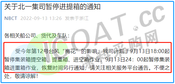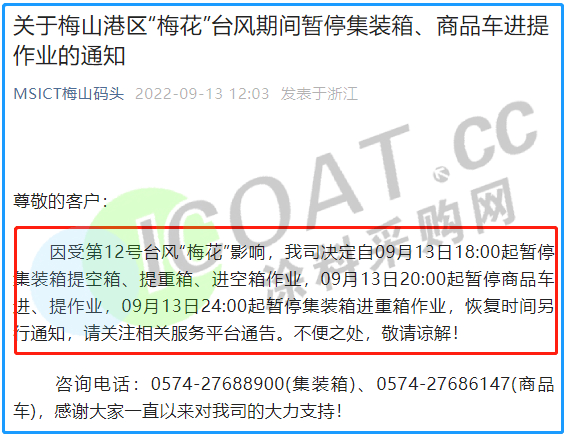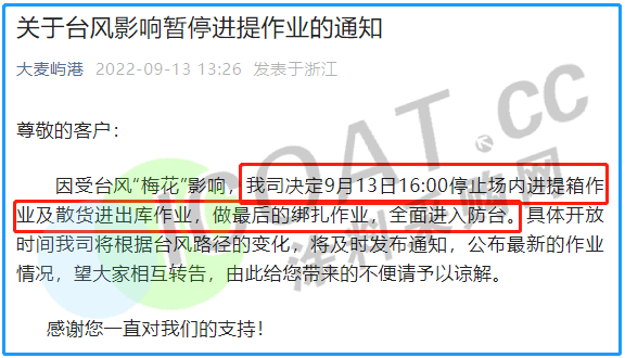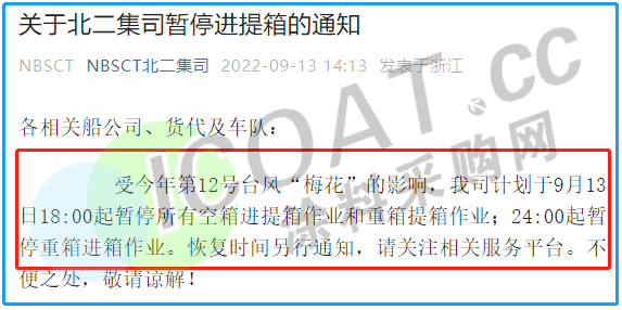 航运停运的同时,台风“梅花”将袭击全球最繁忙的集装箱港口和中国第二大集装箱港口宁波。多地码头陆续通知暂停提箱作业,华东地区或出现出货不畅的局面!