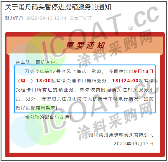 甬舟码头、大麦屿港决定自9月13日(周二)18:00起暂停受理卡口提箱业务,13日24:00起暂停受理卡口所有进提箱业务。