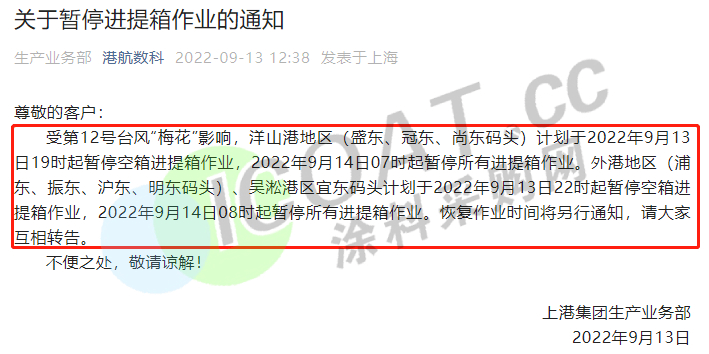 上海洋山港区(盛东、冠东、尚东码头)计划于2022年9月13日19时起暂停空箱进提箱作业,2022年9月14日07时起暂停所有进提箱作业。外港地区(浦东、振东、沪东、明东码头)、吴淞港区宜东码头计划于2022年9月13日22时起暂停空箱进提箱作业,2022年9月14日08时起暂停所有进提箱作业。