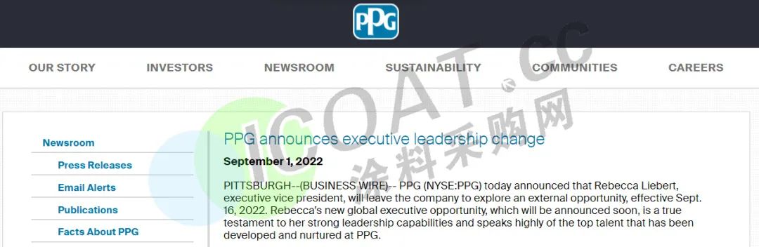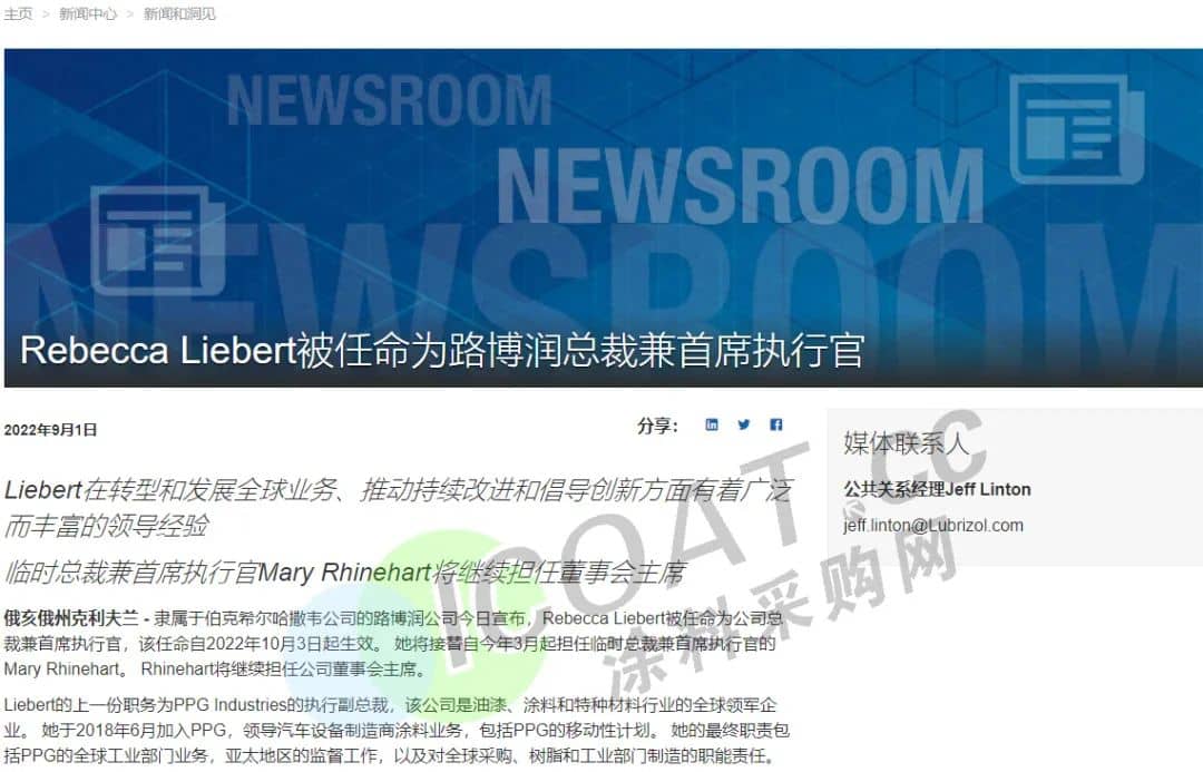 PPG执行副总裁Rebecca Liebert将于9月16日离开公司,与此同时,路博润特种化学公告,Rebecca Liebert被任命为公司总裁兼首席执行官,该任命自10月3日起生效。而在此前,Liebert曾在石化企业霍尼韦尔UOP担任总裁兼首席执行官,以及在雷诺食品包装担任总裁职务。