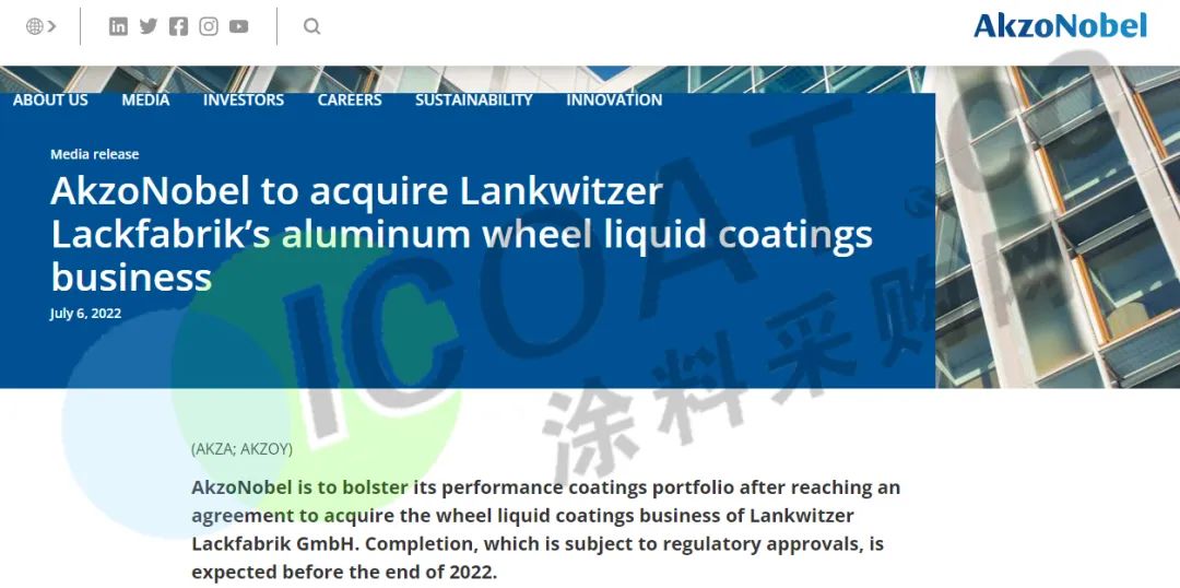 阿克苏诺贝尔宣布与德国Lankwitzer Lackfabrik GmbH达成协议,将收购该公司旗下轮毂液体涂料业务。