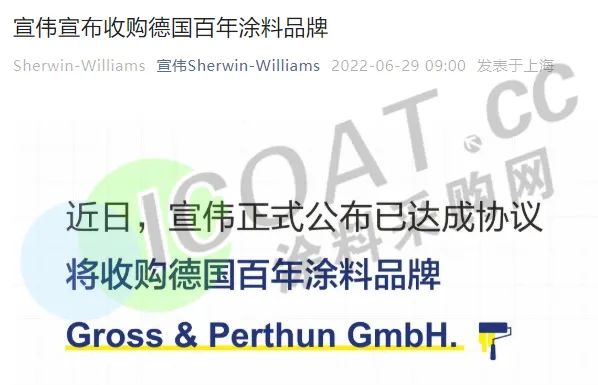 6月30日,宣伟正式公布,已达成协议收购德国百年涂料品牌Gross & Perthun GmbH.。