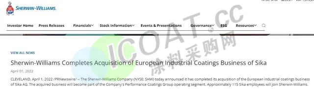 4月1日,宣伟收购西卡欧洲工业涂料业务。