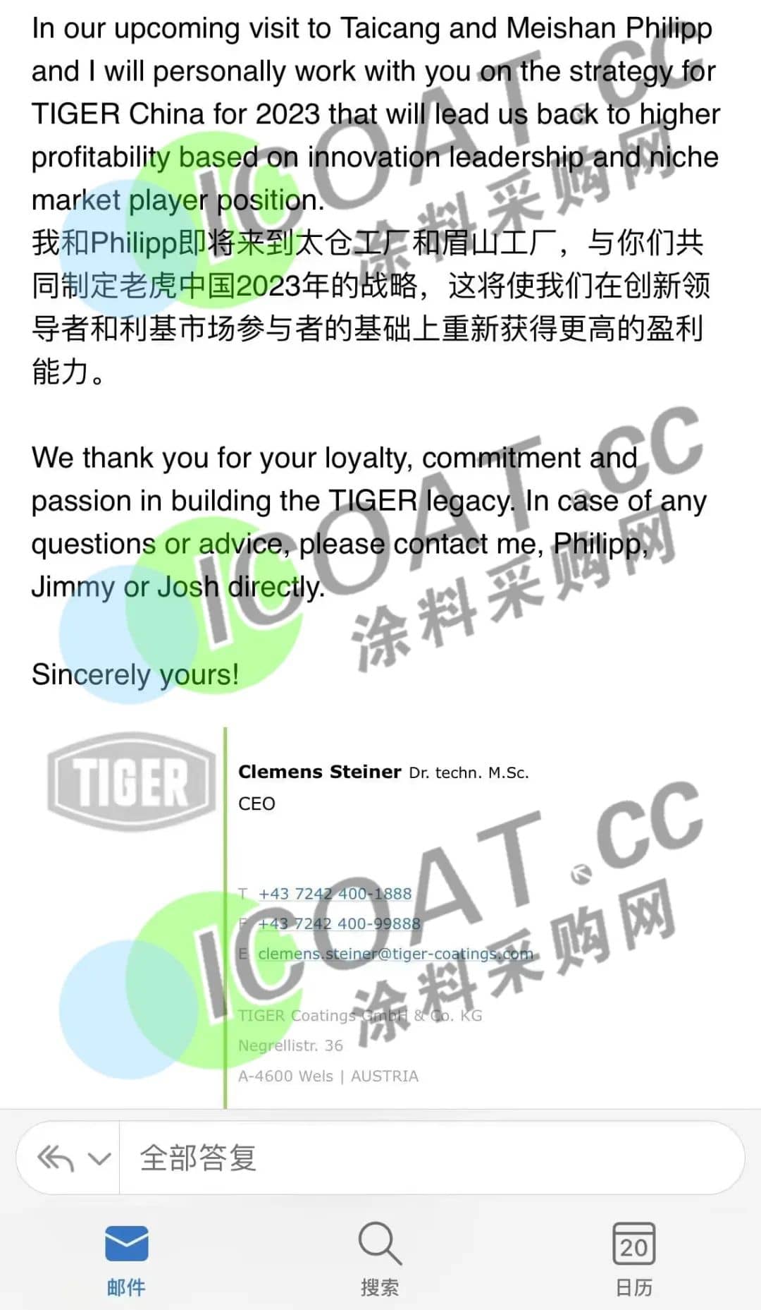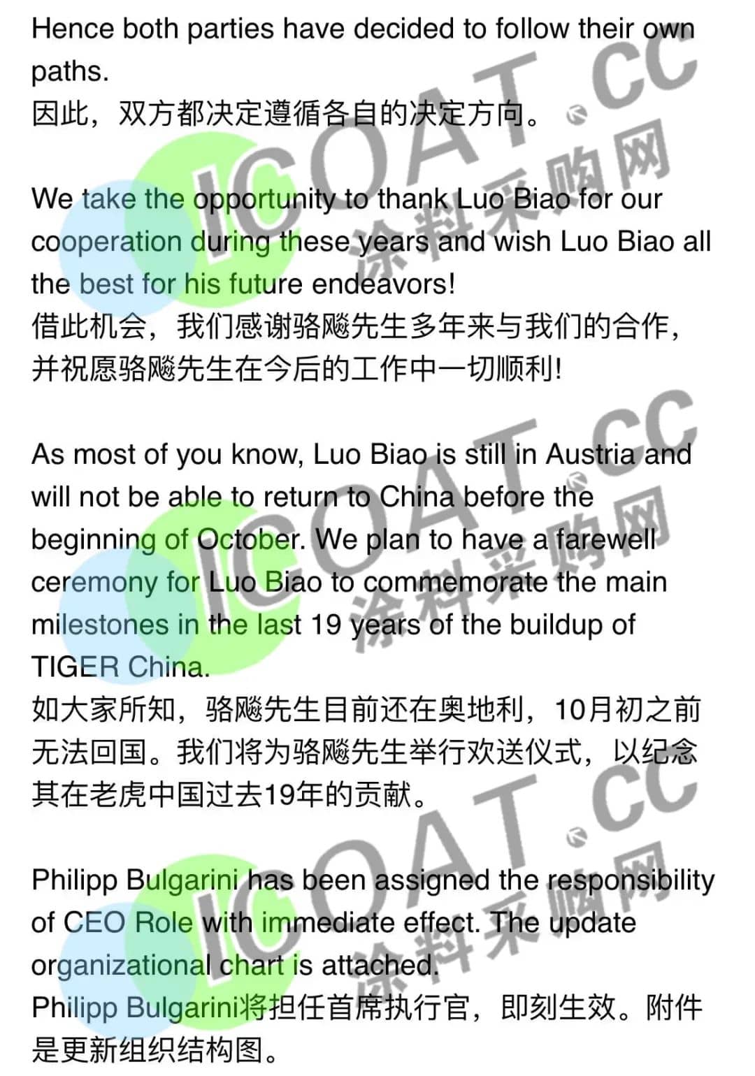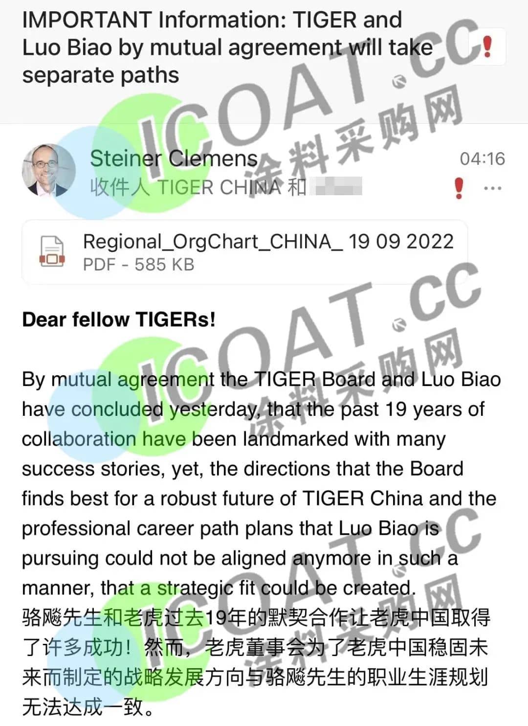 据涂料采购网消息,2022年9月19日,老虎新材料总部发布一份名为《IMPORTANT information:TIGER and Luo Biao by mutual agreement will take seperate paths》的内部邮件称:老虎董事会认为老虎中国发展战略与骆飚先生的职业规划无法达成一致,骆飚先生将离开老虎新材料,Philipp Bulgarini 将担任首席执行官。