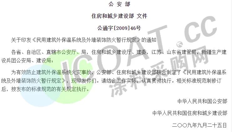 2009年9月,公安部在历史上首次发布民用建筑外保温防火问题的条文——46号文件《民用建筑外保温系统及外墙装饰防火暂行规定》,明确规定,民用建筑外保温材料的燃烧性能不应低于B2级。至此B3级保温材料在建筑工程中被彻底废除。