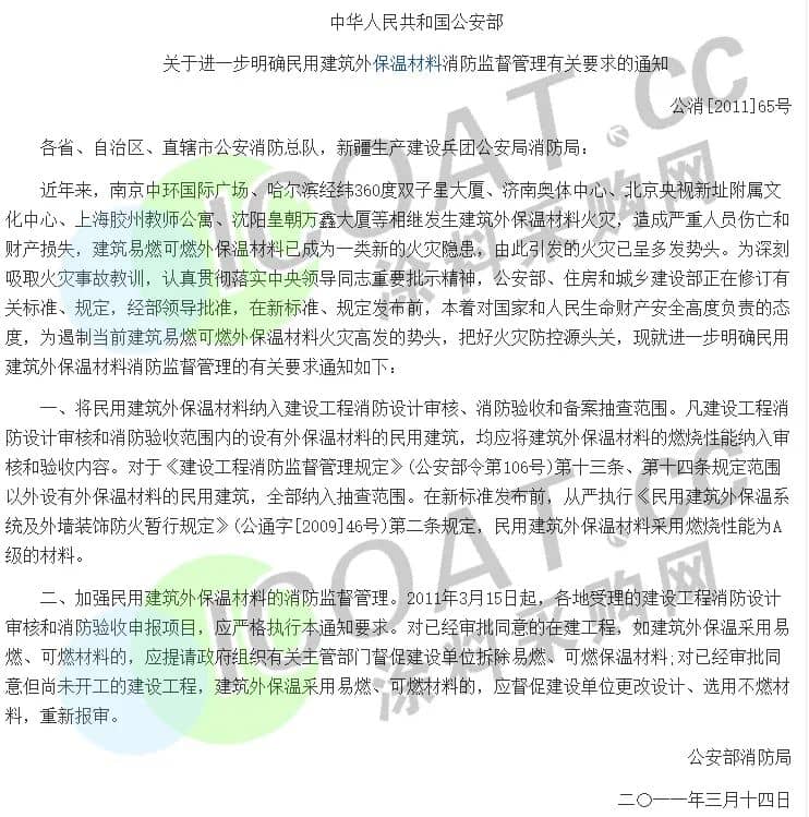 2011年3月,公安部下发公消65号文件《关于进一步明确民用建筑外保温材料消防监督管理有关要求的通知》,规定从严执行46号文件提出的外保温材料燃烧性能应为A级,并且把外保温材料的燃烧性能纳入消防审核的范围,加强施工过程中的消防管理。