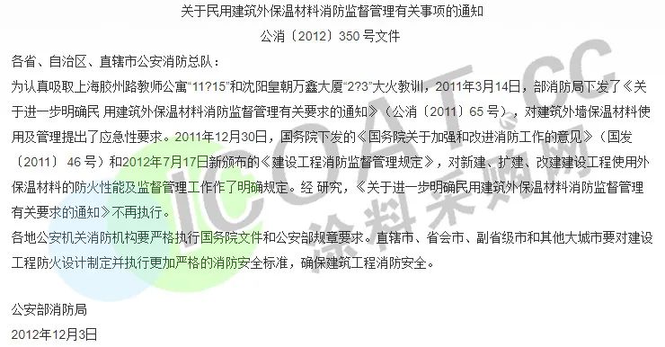 2012年12月3日,公安部消防局下发《关于民用建筑外保温材料消防监督管理有关事项的通知》(350号文件),决定取消执行65号文件。但国家层面对保温材料的生产和使用,一直都维持着比较严格的标准。