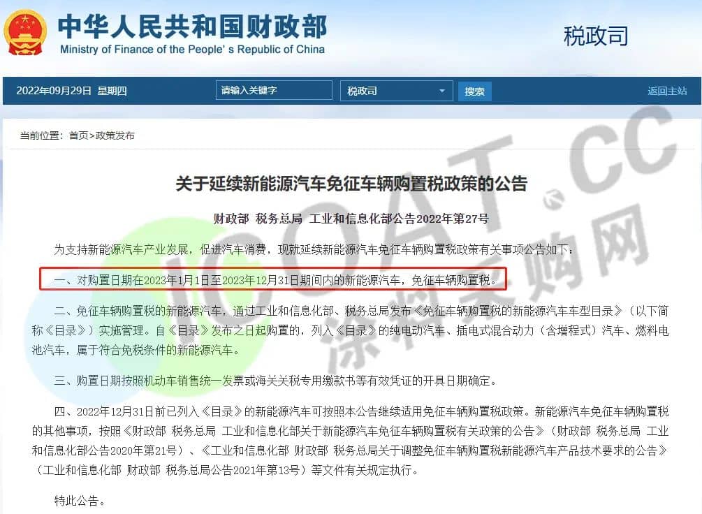 近日,财政部、税务总局、工信部三部门联合发布公告称,对购置日期在2023年1月1日至2023年12月31日期间内的新能源汽车,免征车辆购置税,以支持新能源汽车产业发展,促进汽车消费。这已经是新能源汽车免征购置税政策第三次延期,也证明了国家对于新能源汽车的大力扶持。