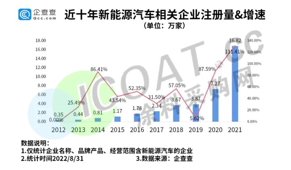数据显示,我国现存新能源汽车相关企业50.56万家。2022年上半年,我国新增新能源汽车相关企业11.04万家,同比增长50.89%。2021年新增16.82万家,同比增长131.41%;2020年新增7.27万家,同比增长87.59%……值得注意的是,除了新成立注册的企业外,还有不少各行各业的企业跨界前来分羹。