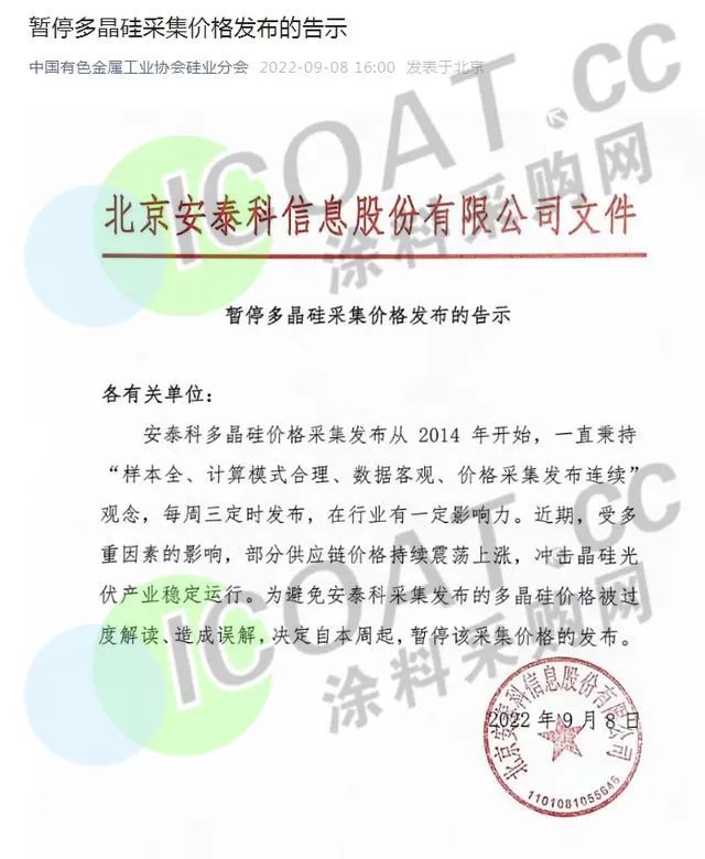 居高不下的硅料还“灼伤”了报价机构,中国有色金属工业协会硅业分会近期宣布暂停已持续8年、每周三例行的多晶硅采集价格发布。