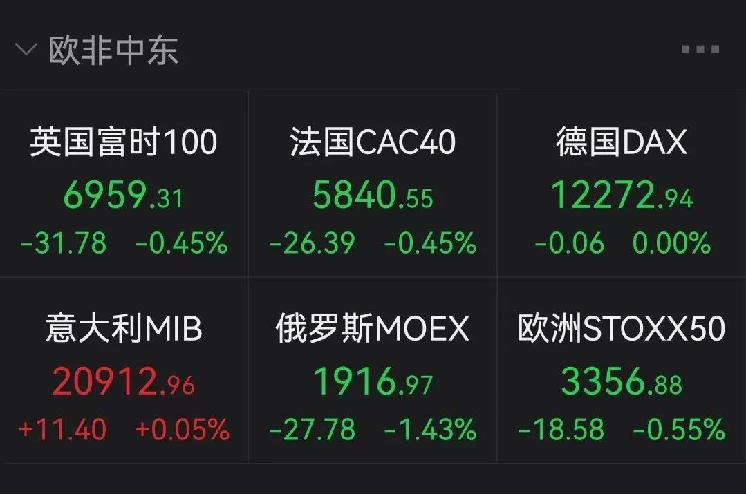 欧洲股市主要股指隔夜小幅震荡,临近尾盘英国富时100指数、法国CAC40指数、德国DAX指数跌幅收窄。