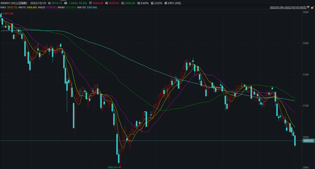 国内股市也一片飘绿,国庆假期结束后首个交易日,沪指跌破3000点大关。上一次跌破3000点,是2022年4月25日。截至收盘,上证指数报收2974.15点,下跌1.66%,跌破3000点重要整数关口。深证成指报收10522.12点,跌幅2.38%,创业板指下跌2.30%,沪深300下跌2.21%,科创50跌幅更达到4.48%。