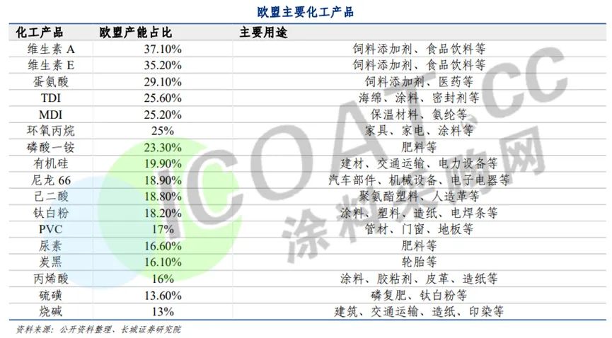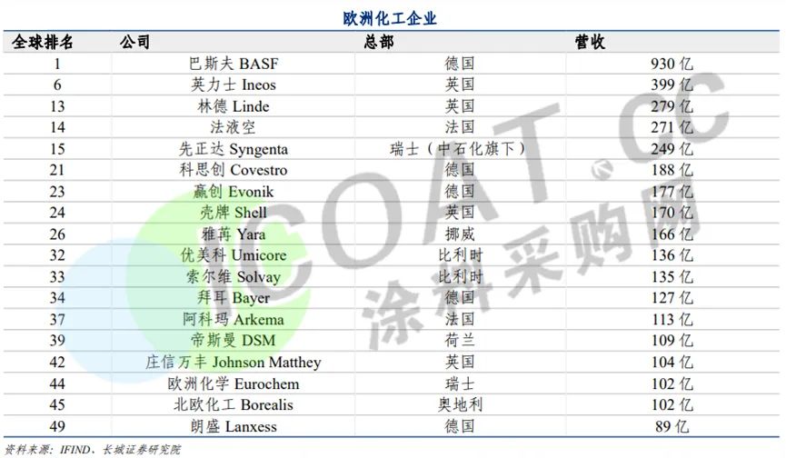 欧盟是全球第二大化工品生产地区,拥有巴斯夫、液化空气、拜耳、科思创、朗盛等众多化工巨头。2022年全球化工企业50强中,欧洲地区就有18家,预计减产将会对基础化工原材料供应产生影响。