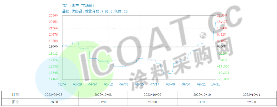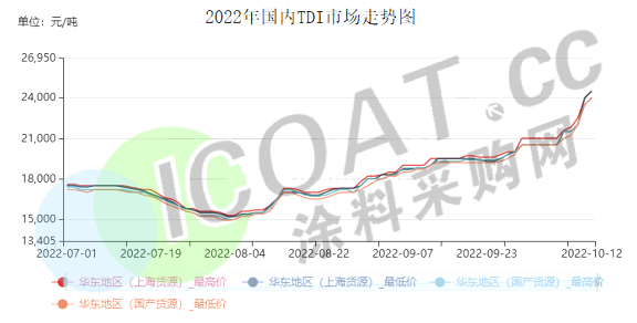 由于欧洲能源和原材料成本飙升,当地TDI工厂低开工率,货紧价扬的态势,也使得市场价格迅速飙高。上海巴斯夫10月份TDI上调3000元/吨,国内TDI现货价格已经超过24000元/吨,行业利润达到6500元/吨,预计TDI价格仍有上涨空间。
