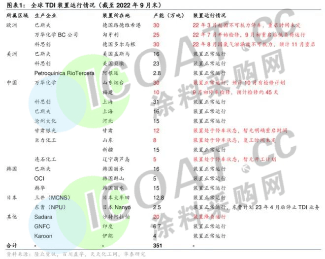 目前TDI全球名义产能351万吨,检修装置或面临检修装置产能达182万吨,占全球TDI总产能的52.88%,也就是说近一半的装置处于停产状态,全球TDI面临供给紧张格局。