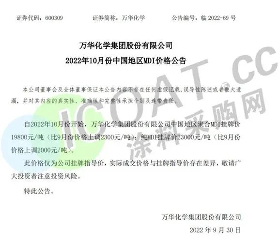 随着冬季供暖的要求,MDI部分需求将在10月被释放出来;国外方面,近期海外能源危机问题仍较为突出,利好MDI价格。陶氏欧洲或自9月1日起对欧洲市场MDI、聚醚和组合料产品进行涨价,上涨幅度为200欧元/吨(约合人民币1368元人民币/吨)。万华化学自10月份开始,中国地区聚合MDI上调2300元/吨,纯MDI上调2000元/吨。