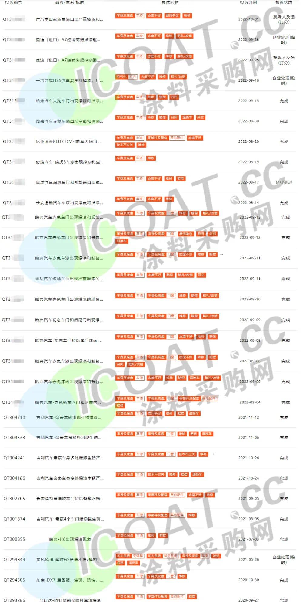 事实上,不仅是哈弗赤兔,在某汽车投诉网站,搜索“掉漆”关键词,弹出的相关投诉多达数十页,吉利、长安、比亚迪、一汽、广汽、东风、马自达、奥迪、奇瑞等知名汽车品牌均被波及。