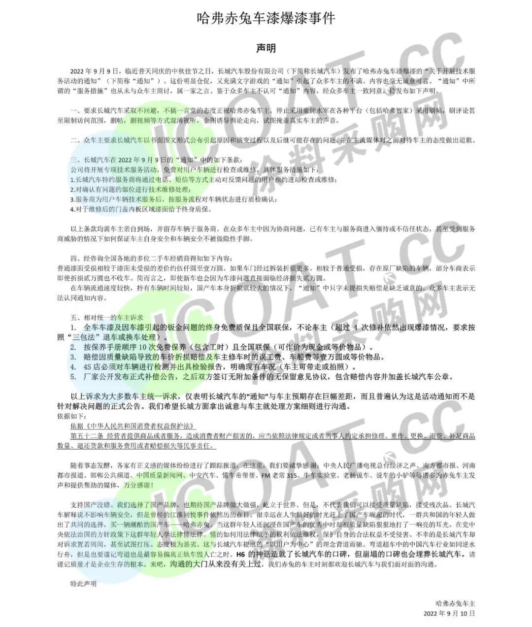 对于赤兔出现的漆面质量问题,长城哈弗方面承认这是自身工艺问题导致,表示可以免费喷漆修复并对修复区域漆面终身质保。但车主们对此并不满意,认为这是汽车本身的质量问题,补漆不一定能根治,还会造成二手价值受损。哈弗赤兔的质量问题,也引发了批量车主拉横幅维权,希望厂家能给一个合理的解决方案。