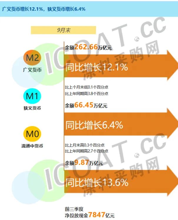 9月末,广义货币(M2)余额262.66万亿元,同比增长12.1%,增速比上月末低0.1个百分点,比上年同期高3.8个百分点;狭义货币(M1)余额66.45万亿元,同比增长6.4%,增速分别比上月末和上年同期高0.3个和2.7个百分点;流通中货币(M0)余额9.87万亿元,同比增长13.6%。前三季度净投放现金7847亿元。