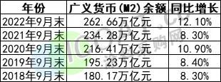 广义货币(M2)余额从2018年9月末的180.17万亿元增至今年9月末的262.66万亿元,增长了82.49万亿元,涨幅达45.78%。近五年来,9月末广义货币(M2)余额同比涨幅一直处于8.3%以上,今年更是创造近五年新高,同比增长达12.1%。