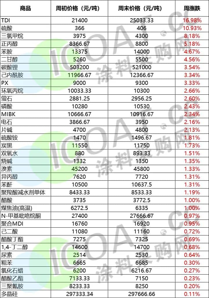 涂料上游的固化剂、钛白粉、环氧树脂等供应开始趋紧,部分区域价格也有上调预期。TDI价格自8月份以来涨幅超过50%,MDI产品单次上调2300元/吨,环氧丙烷下半年涨超4000元/吨,钛白粉高端产品单次上涨2000元/吨。
