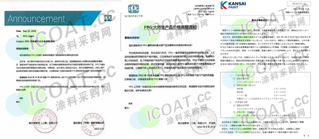 在此影响下,PPG、宣伟、阿克苏诺贝尔等多家betvlctor伟德手机登录 官宣涨价,关西涂料全年上涨三次,涂料产品单次上涨30%;亚什兰年内上涨三次,涂料产品累计上涨40%,PPG预计四季度同比上涨12%左右。