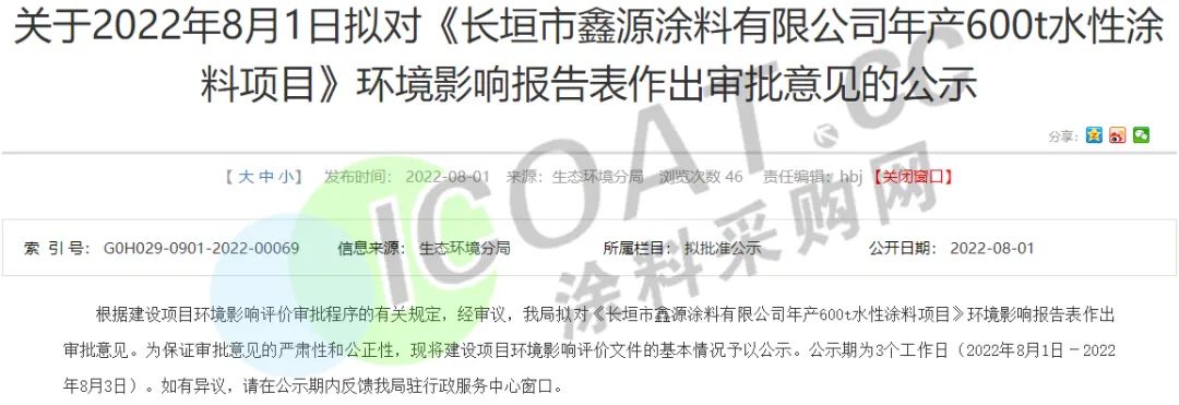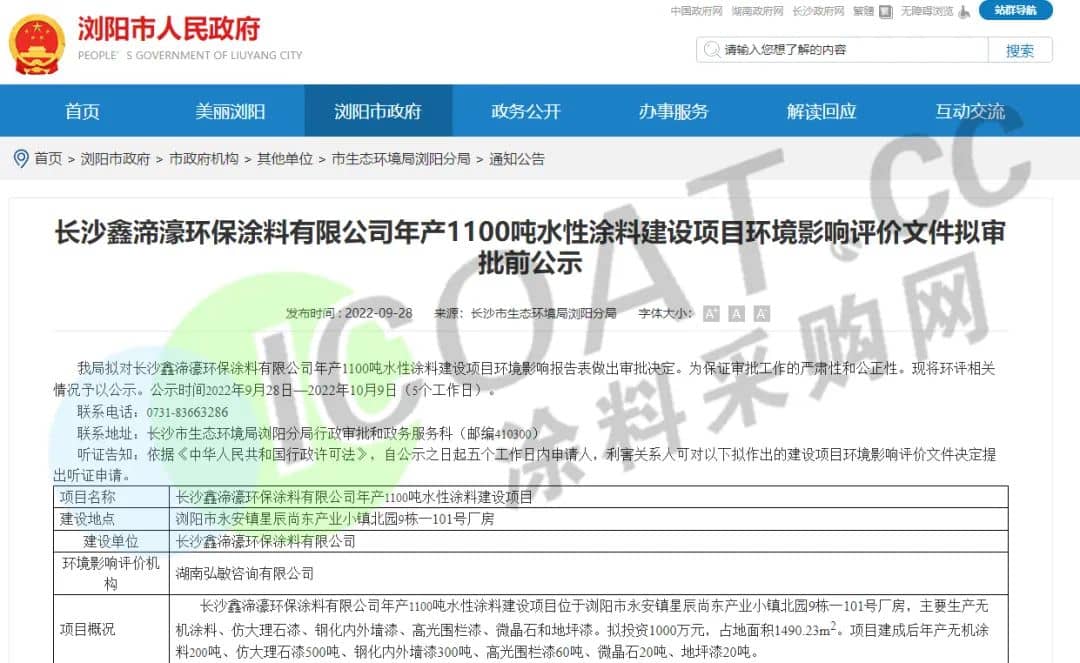 长沙鑫渧濠环保涂料有限公司:年产1100吨水性涂料建设项目,拟投资1000万元。