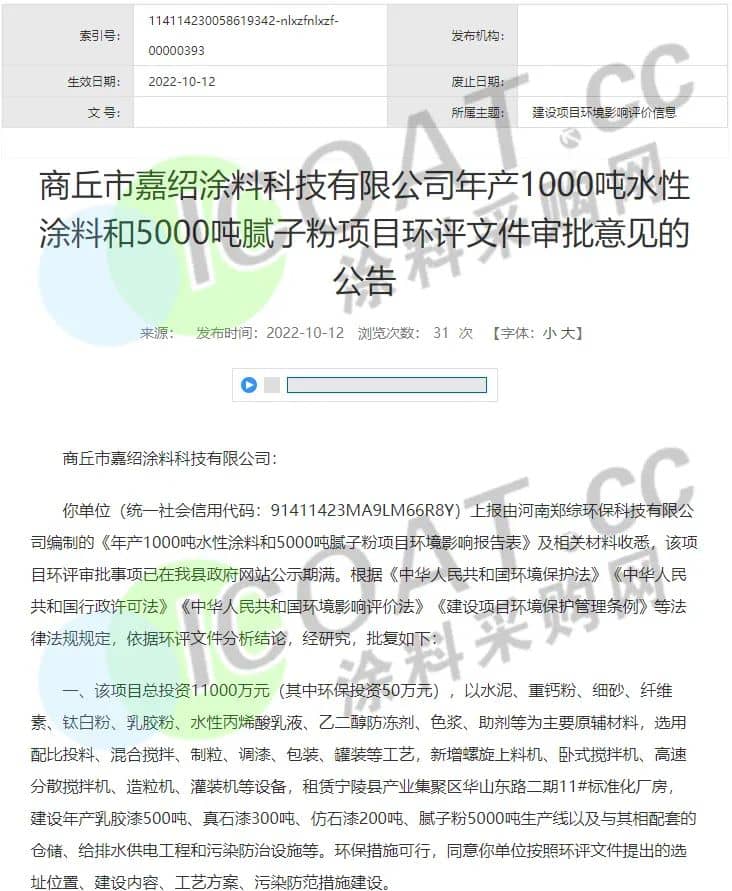 商丘市嘉绍涂料科技有限公司:年产1000吨水性涂料和5000吨腻子粉项目,总投资11000万元。