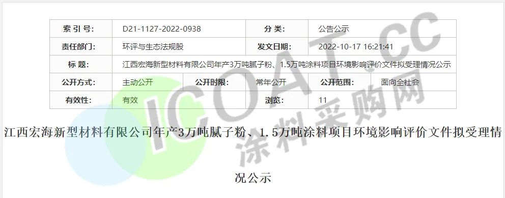 江西宏海新型材料有限公司:年产3万吨腻子粉、1.5万吨涂料项目,总投资100万元。