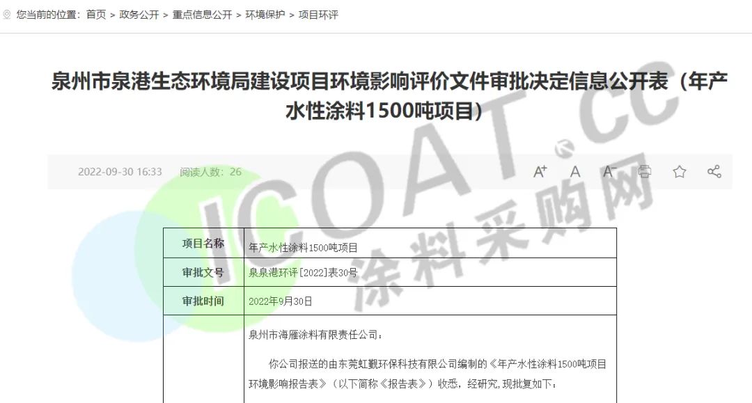 泉州市海雁涂料有限责任公司:年产水性涂料1500吨项目。