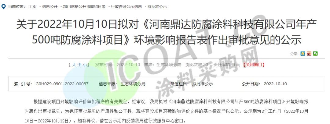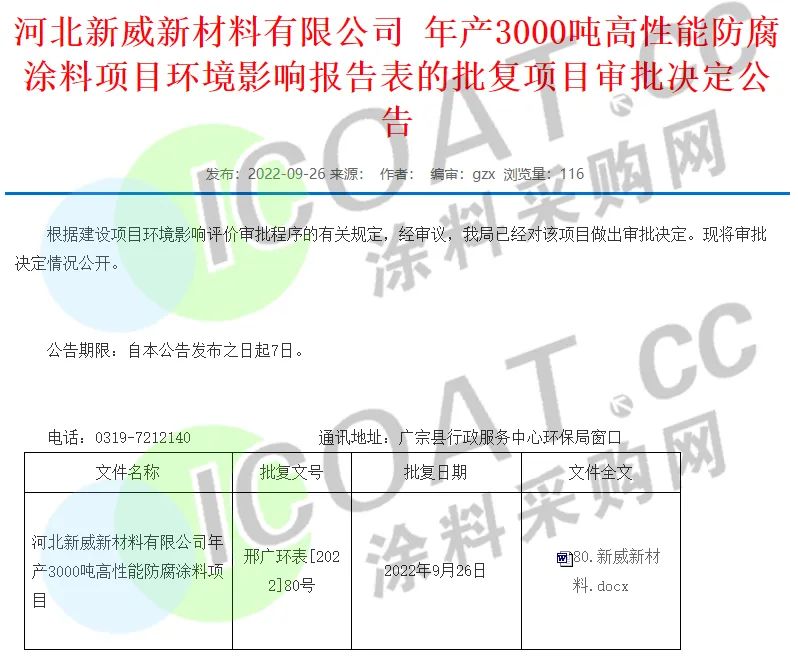 河北新威新材料有限公司:年产3000吨高性能防腐涂料项目,项目总投资300万元。