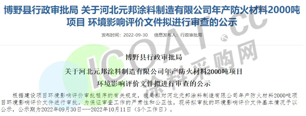 河北元邦涂料制造有限公司:年产防火材料2000吨项目,项目总投资300万元。