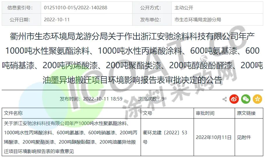 浙江安驰涂料科技有限公司:年产1000吨水性聚氨酯涂料、1000吨水性丙烯酸涂料、600吨氨基漆、600吨硝基漆、200吨丙烯酸漆、200吨聚酯类漆、200吨醇酸酚醛漆、200吨油墨异地搬迁项目。