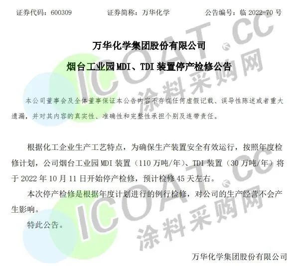 近日,化工“一哥”万华化学发布检修公告,称其烟台工业园MDI 装置(110 万吨/年)、BETVLCTOR伟德国际网页版 装置(30万吨/年)将于2022年10月11日开始停产检修,预计检修45天左右。