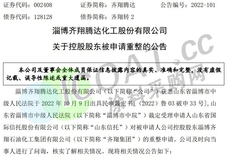 近日,化工上市公司齐翔腾达发布公告称,山东省淄博市中级人民法院出具民事裁定书,裁定受理对被申请人公司控股股东淄博齐翔石油化工集团有限公司的重整申请。齐翔腾达表示,齐翔集团能否重整成功存在不确定性,是否导致公司控制权变动也存在不确定性。
