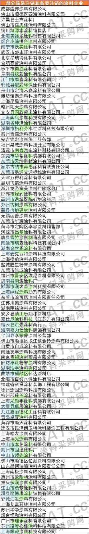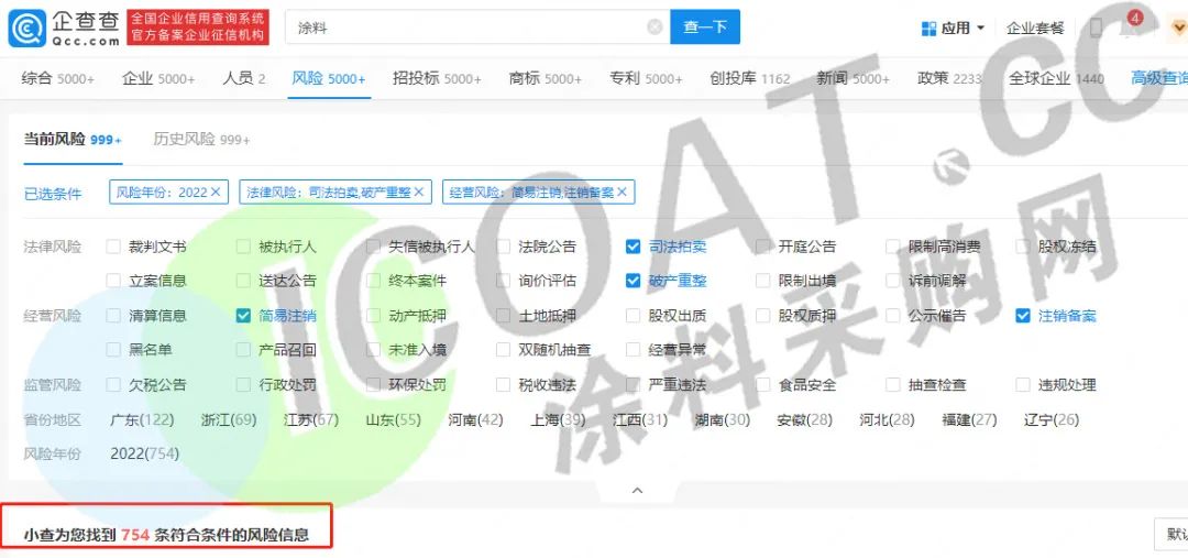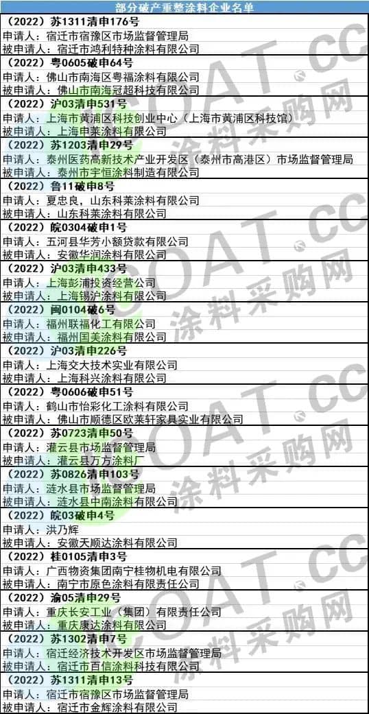(含涂料制造、销售等名称中包括“涂料”关键词的企业)出现破产重整、注销拍卖等风险的企业超过700家,覆盖了上海、广东、江苏、重庆、广西、福建等多个省市地区。
